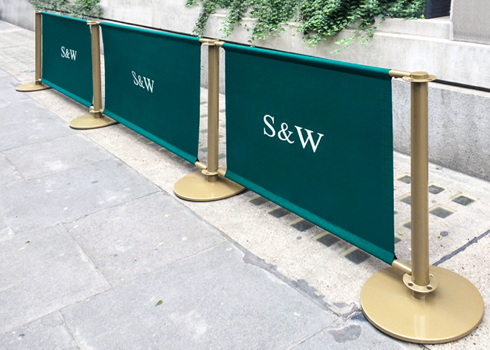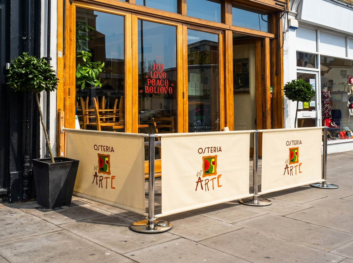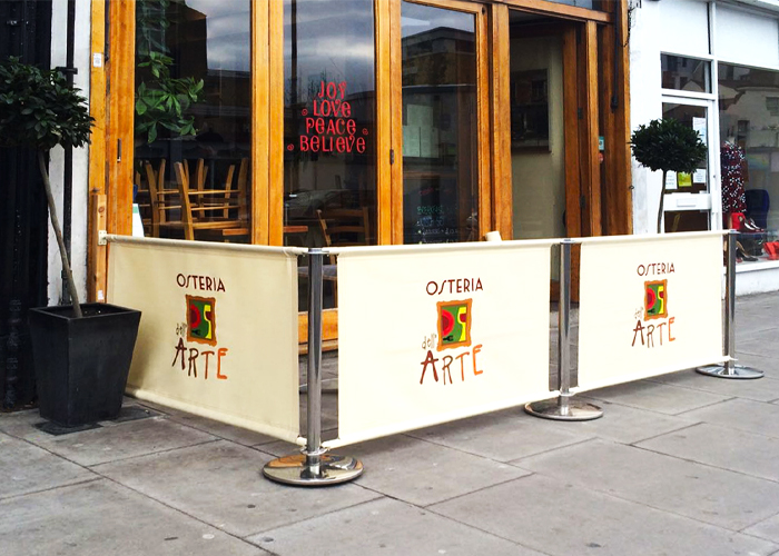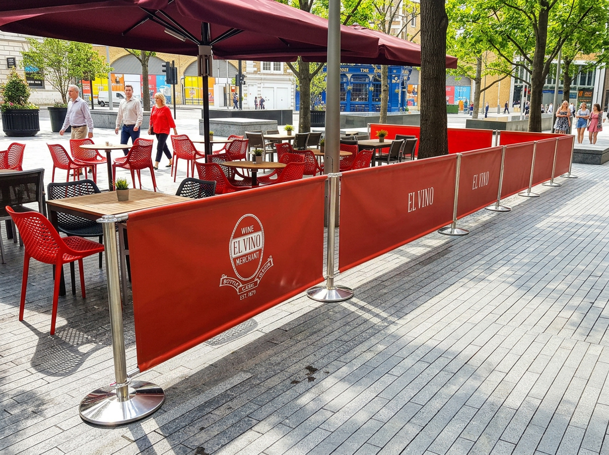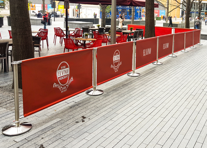 The perfect solution for Restaurants and Bars who want to provide comfortable, elegant outside seating areas. We have spent time in designing our barriers with the emphasis on strength and style. Our posts are extremely sturdy with low centres of gravity. They are available powder-coated or lacquered to customers’ specifications. Our Barriers are manufactured using any of our high quality fabrics. Easily assembled and dismantled they are not classed as permanent fixtures and offer excellent branding potential.