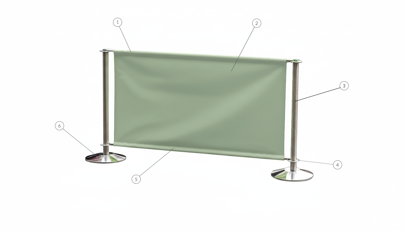1: top bar 2: fabric panel 3: post 4: clip 5: bottom bar 6: base