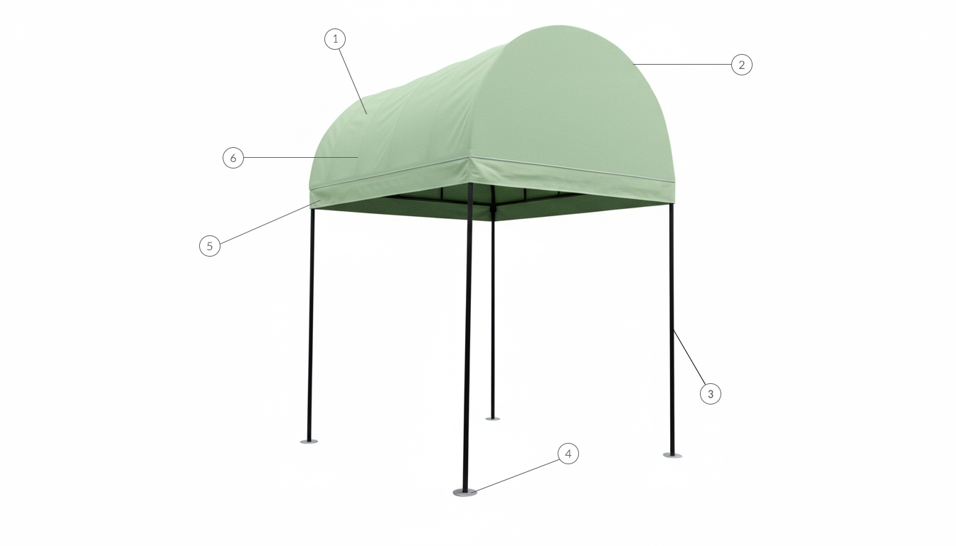 1: cloth panel 2: frame 3: pole 4: concealed base/footplate/planter 5: valance 6: subframe