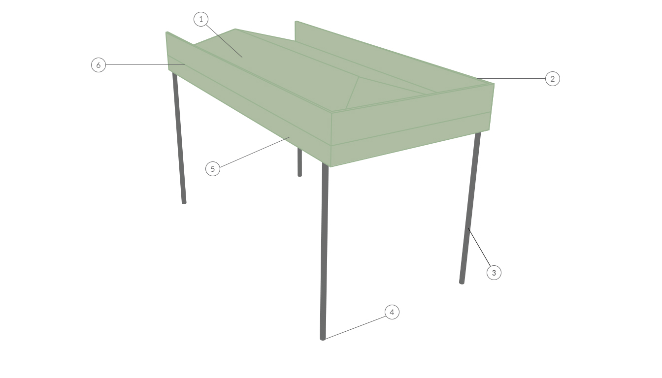 1: cloth panel 2: frame 3: pole 4: concealed base/footplate/planter 5: valance 6: subframe